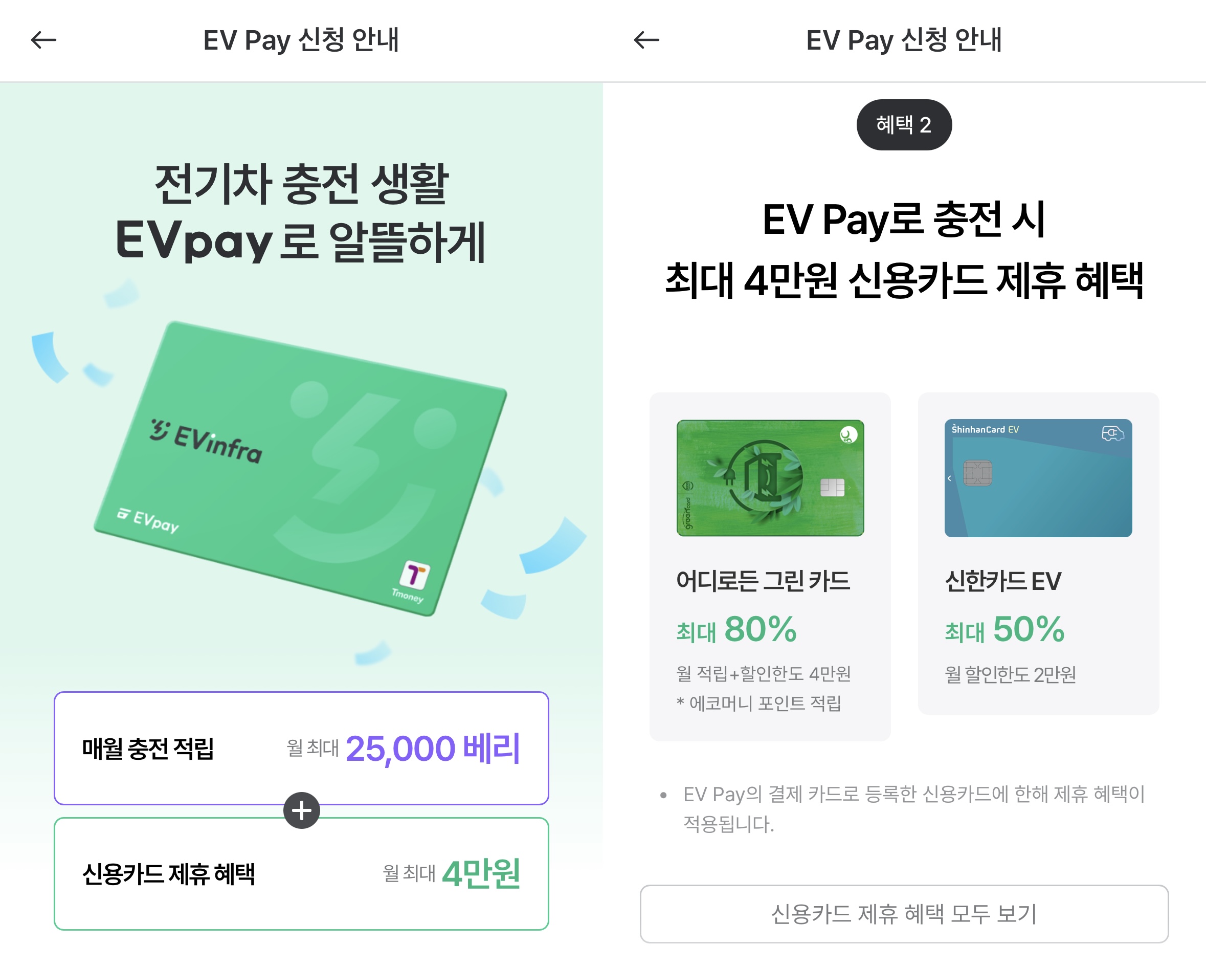 할인을 받을 수 있는 다양한 신용카드 제휴 혜택을 확인해 보시려면 아래의 버튼을 클릭하면 EV Infra 앱을 바로 다운로드하시기 바랍니다.