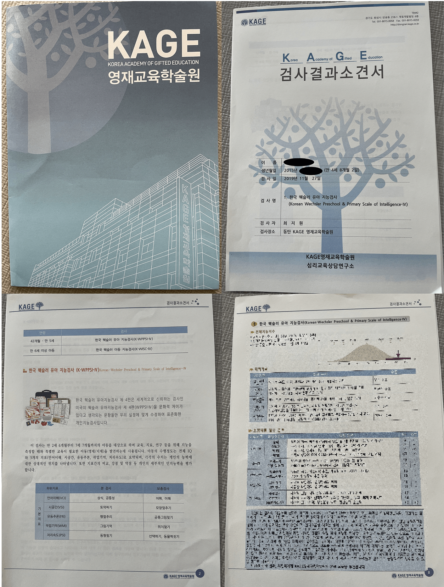 KAGE에서 웩슬러 검사를 완료하고 일정 수준의 결과가 나오면 바로 영재원에 입학이 가능하기 때문입니다.