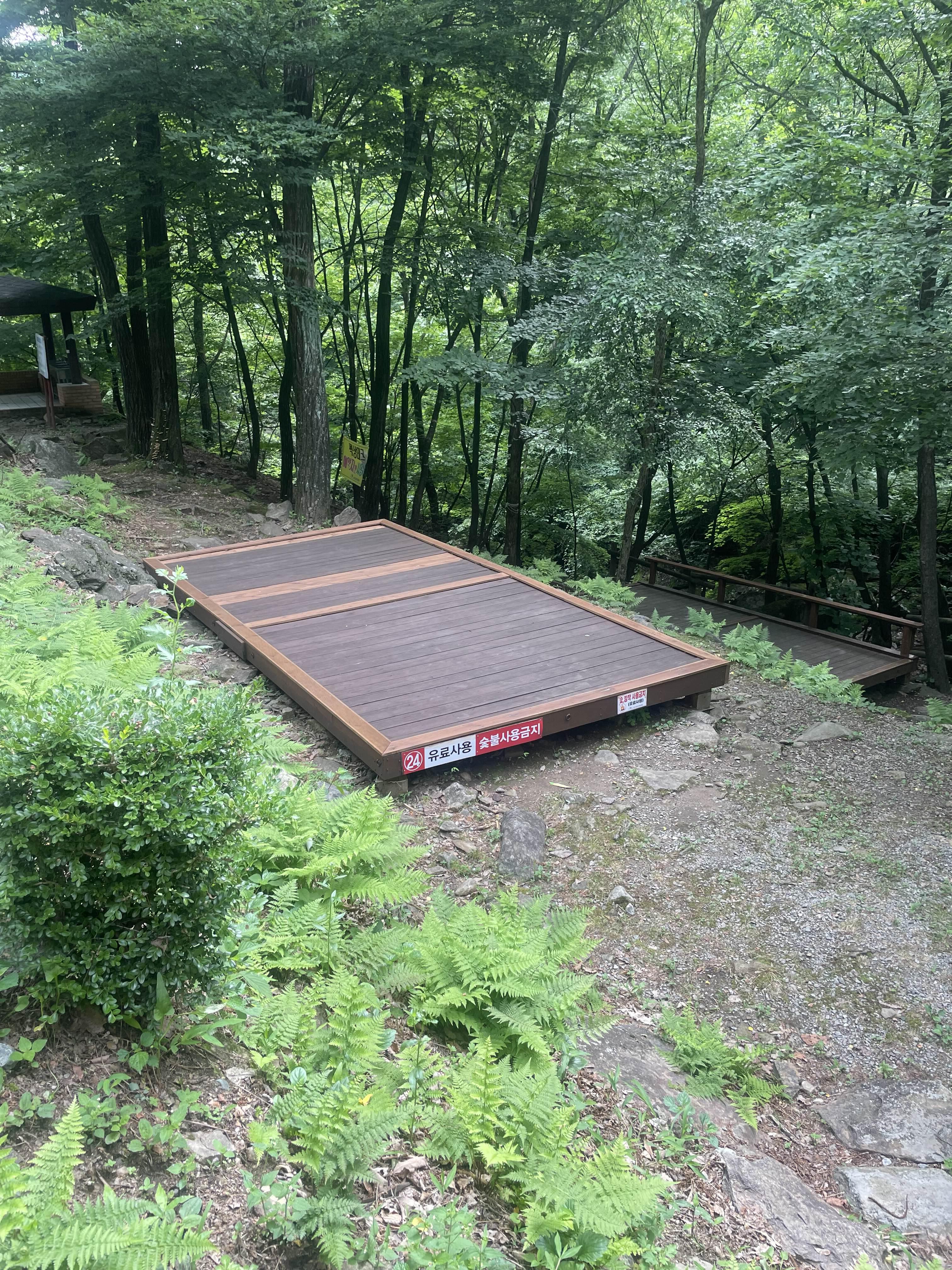시설안내도를 보시면 알수 있듯이 계곡을 따라 총 26개의 데크가 마련되어 있습니다. 데크를 이용하려면 숲나들e(https://www.foresttrip.go.kr/main.do)사이트에서 미리 예약을 하고 방문하셔야 합니다.