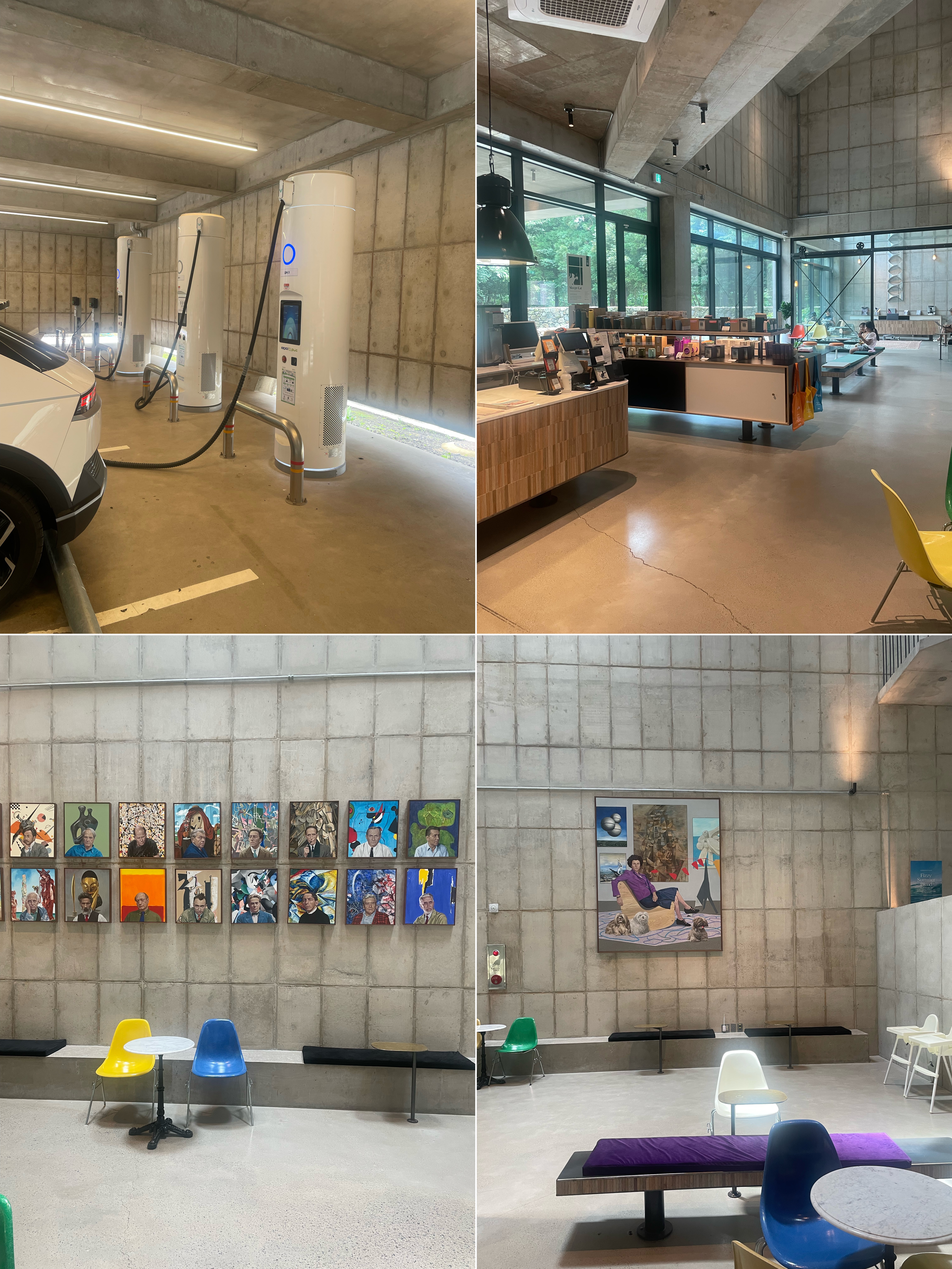 전기차를 렌트하셨다면 충전소를 찾아가셔야 할 텐데요. 전기차 충전하면서 커피를 마실 수 있는 테라로사 에코 라운지가 있습니다.