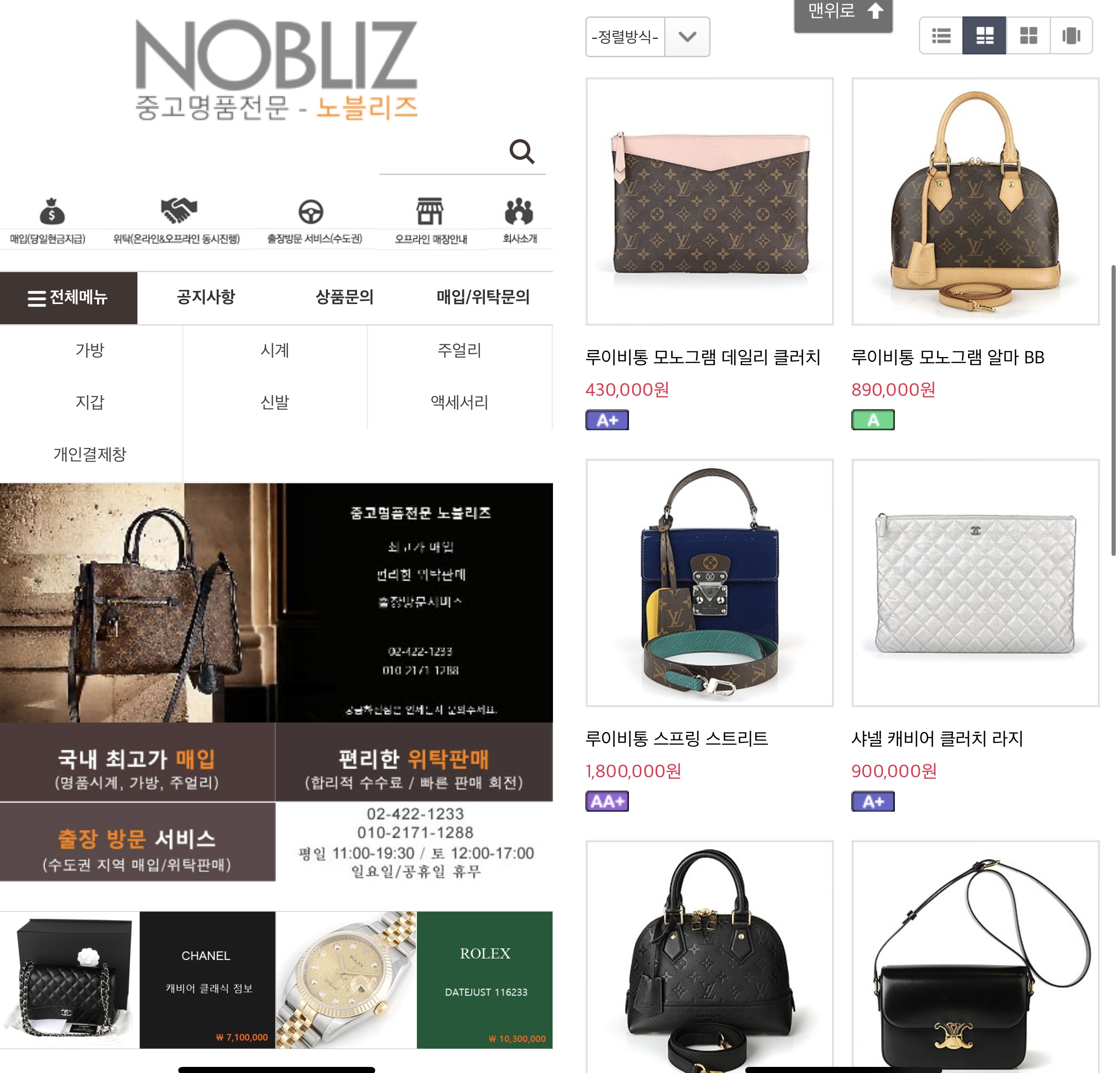 노블리즈는 온라인 쇼핑몰과 오프라인 매장을 운영하는 중고명품 전문점입니다. 명품가방, 시계, 주얼리 등 다양한 제품을 고가에 매입하고 위탁판매도 가능합니다.