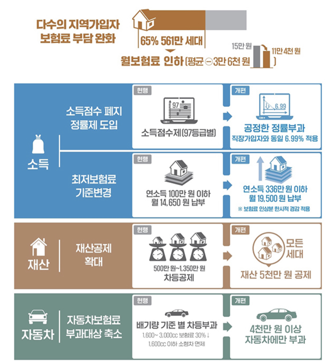 - 지역가입자는 재산,자동차 보험료 축소, 소득 정률제 도입으로 지역가입자 중 65%의 보험료가 인하됨