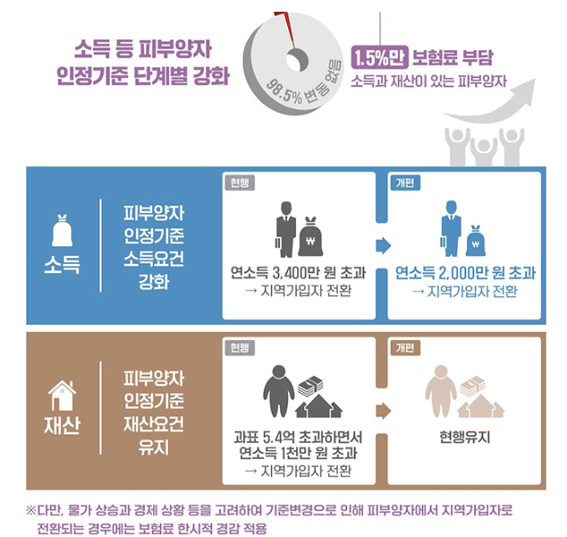 피부양자의 경우에는 과세소득 합산 기준 연 소득이 2000만 원을 넘는 피부양자는 지역가입자로 전환해 보험료를 새로 납부하도록 개편되었습니다.