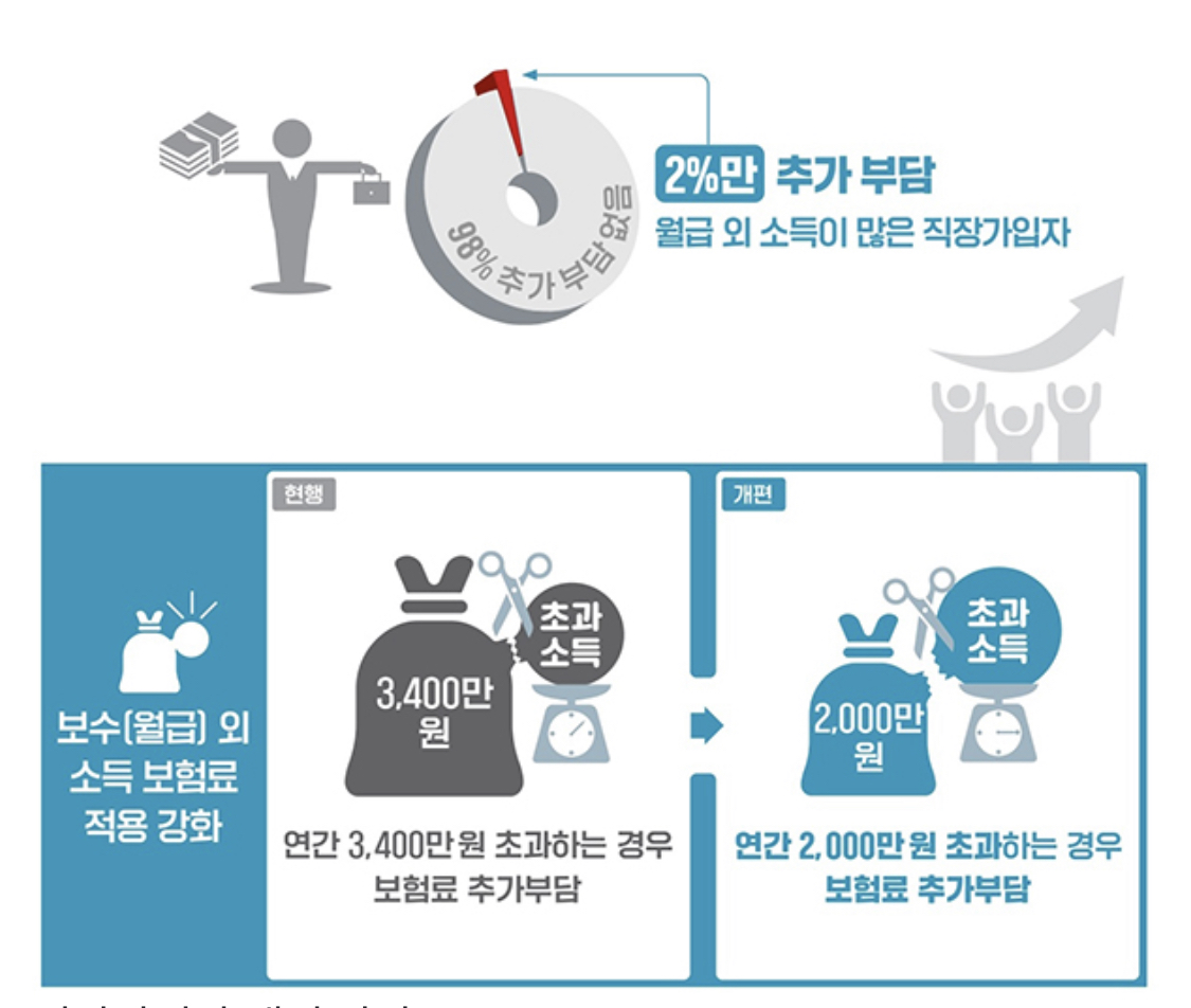 이번 개편에서는 보수(월급) 외 소득월액 보험료 부과 대상을 확대, 보수 외 소득에 대해 2%의 직장가입자의 보험료를 인상하였습니다.