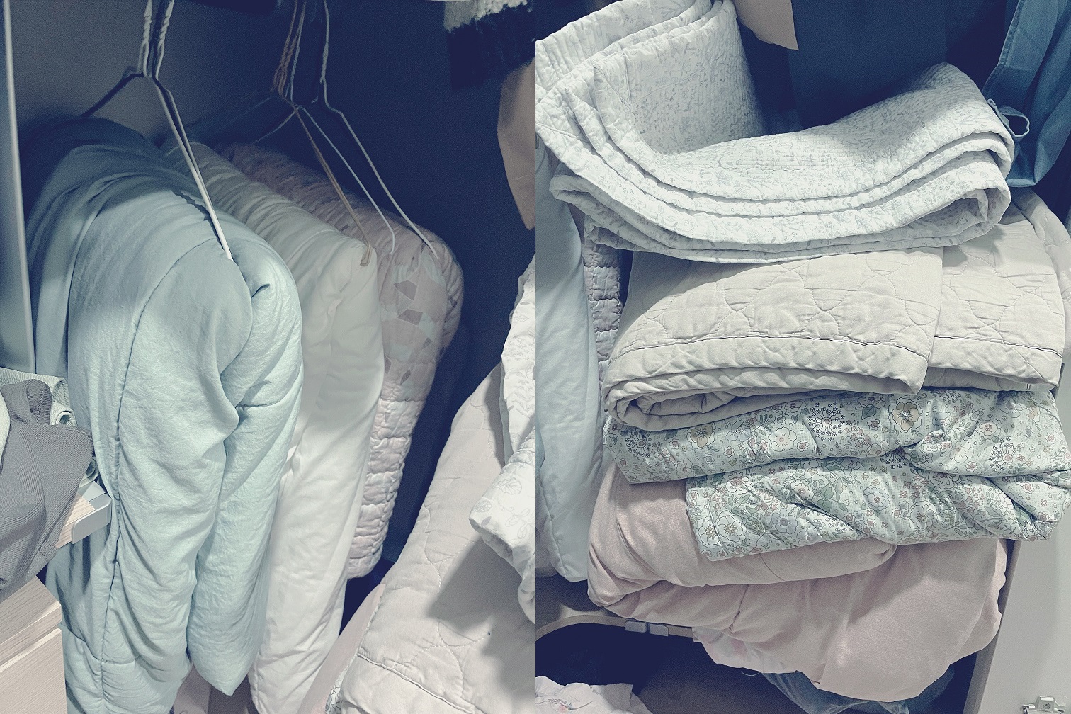 현재 정리되어 있는 이불 상태입니다😖 그냥 접어 쌓아 둔곳과 옷걸이를 단단하게 겹쳐 걸어놓은 곳 둘다 지저분하네요😩