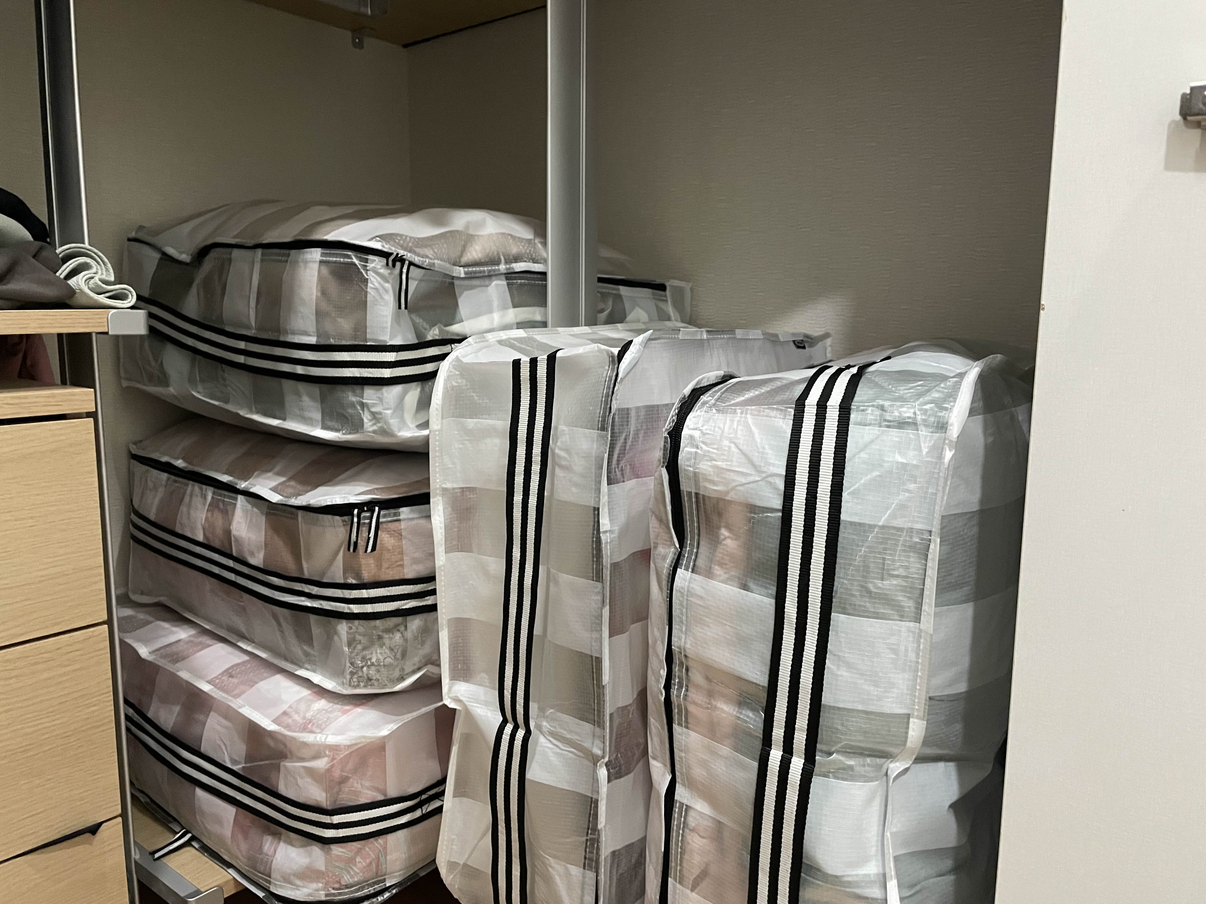 그동안 이불 수납이 항상 고민이 많아 압축팩도 써보고..  원통형태의 이불 수납함도 써보고.. 옷걸이 형태로 수납도 해봤었는데.. 현재로는 이 방법이 가장 마음에 듭니다. 손잡이도 달려있어 아래에 있는 수납함을 꺼내기도 수월 할 듯합니다. 반투명 재질이라 안의 내용물이 살짝 보이기도 하지만. 라벨링을 추가하면 물건 찾을 때 더 쉽겠지요.