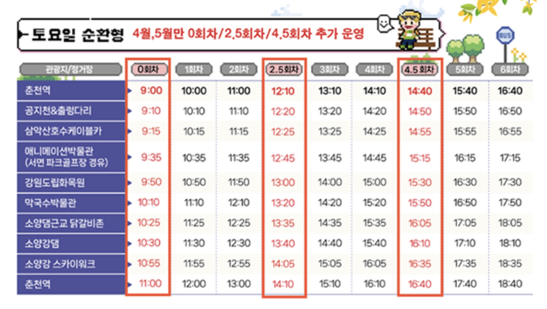 4월 5일부터 5월 31일까지는 1일 9회로 추가 운영됩니다.