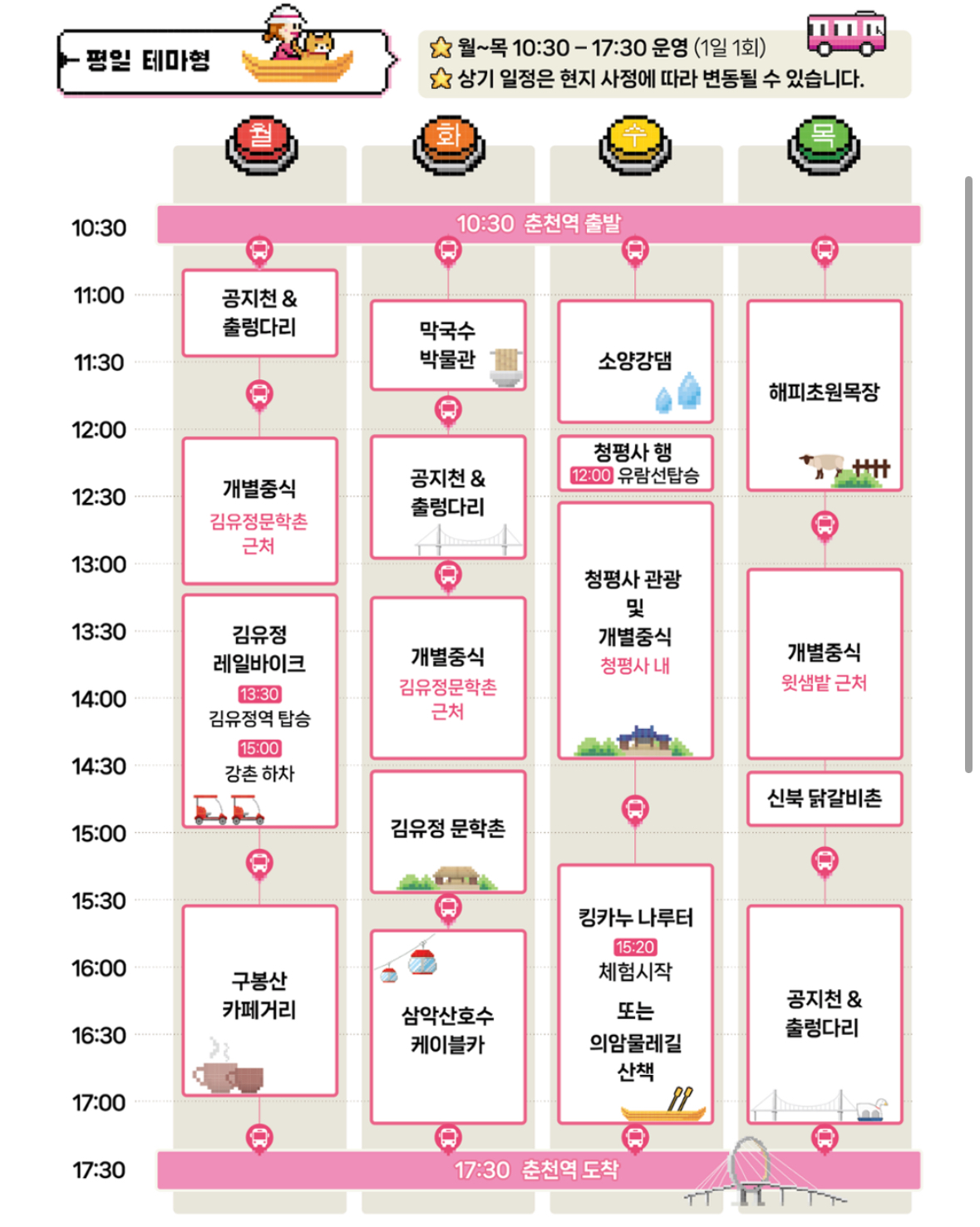 - 특징: 요일별 특색 있는 테마 코스 운영 (예: 월요일은 김유정역 레일바이크 코스, 수요일은 소양강댐+킹카누 체험 코스 등)