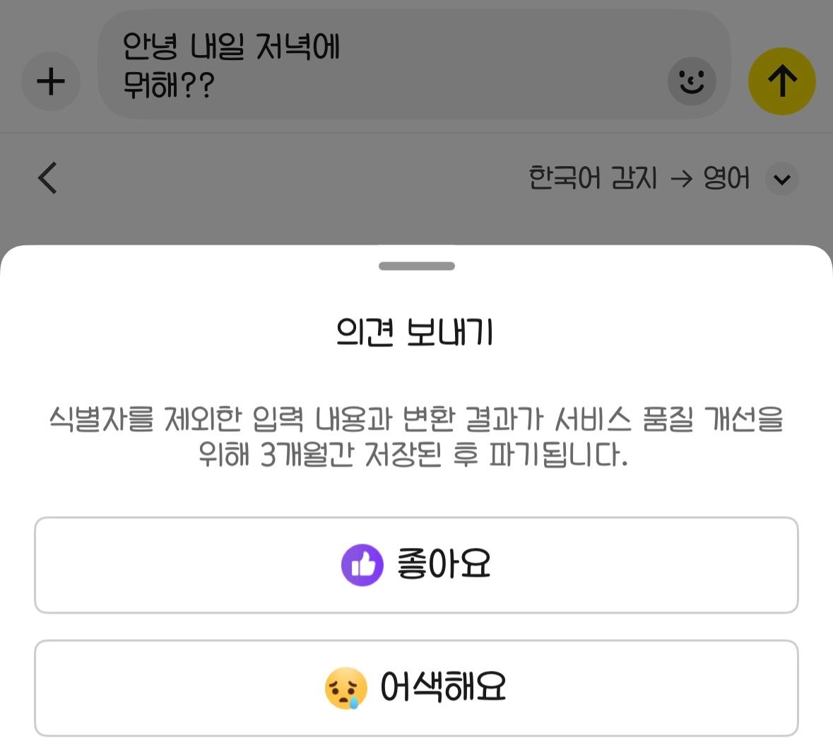 안녕 내일 저녁에 뭐해? 하고 입력했는데.. 문법이 틀린 것같진 않지만 번역이 좀 부자연스러운 기분이 들어 의견보내기를 클릭해 어색해요 라는 의견을 보내보았습니다.