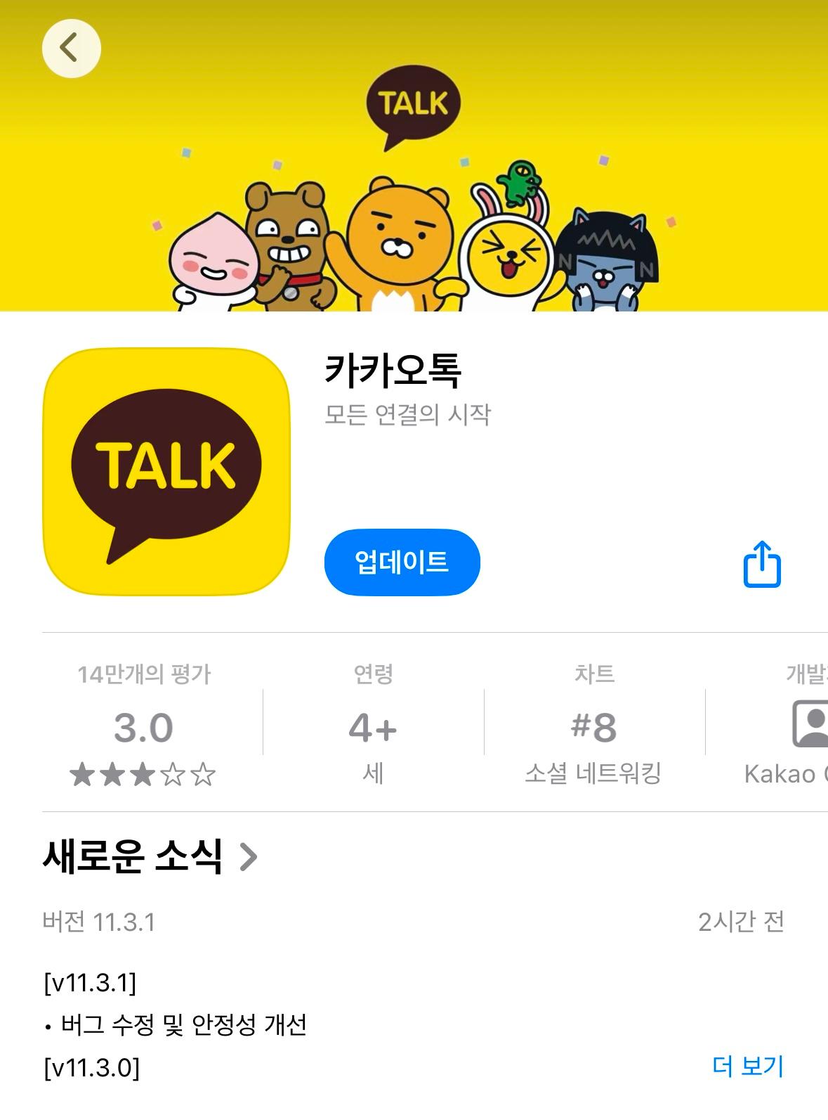 제가 사용하고 있는 카카오톡의 버전도 11.3이 아니길래 앱스토어에서 바로 업데이트를 진행하였습니다.