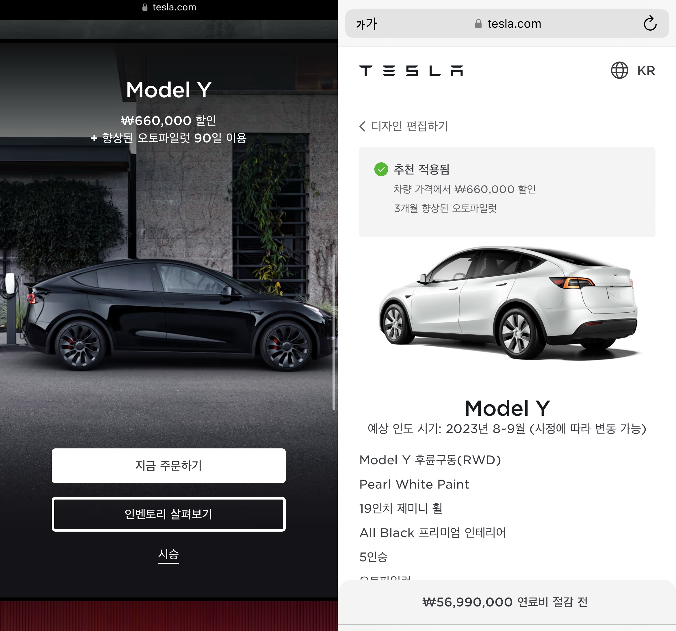 또한 추천 프로그램을 이용하여 구매하면 추가 혜택을 받을 수 있습니다. 추천 프로그램을 이용하 모델 Y를 구매할 경우 660,000원 할인, 향상된 오토파일럿 90일 이용의 혜택을 받을 수 있습니다.