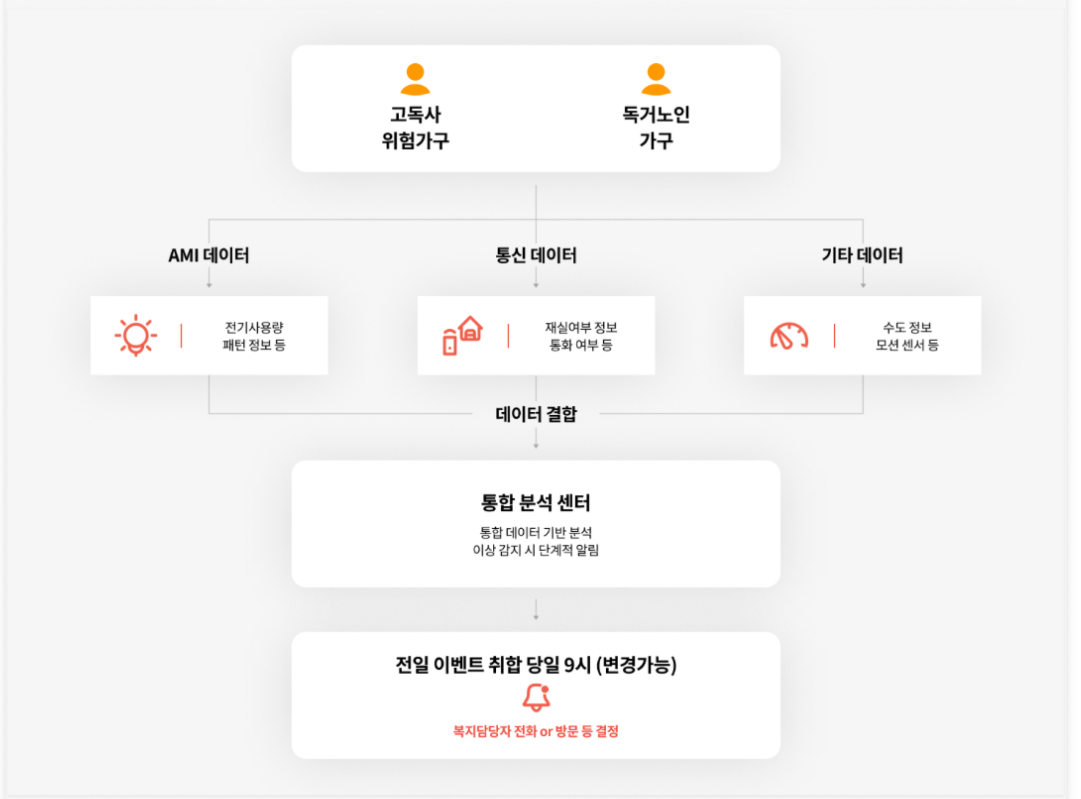 한국전력의 고독사 방지 서비스는 전력 빅데이터와 통신 데이터를 융합하여 1인 가구의 생활 패턴을 분석합니다. 이를 통해 이상 징후를 감지하고, 응급 상황을 예방할 수 있습니다. 서비스의 주요 동작 원리는 다음과 같습니다.
