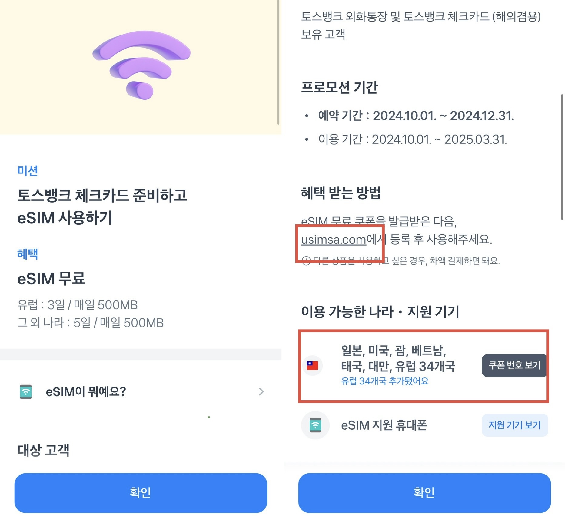 아래 쿠폰 보기를 클릭해 복사 후 usimsa.com을 클릭해 쿠폰을 등록하면 됩니다. eSIM을 지원하는 휴대폰도 꼭 확인하고 진행하시기 바랍니다.
