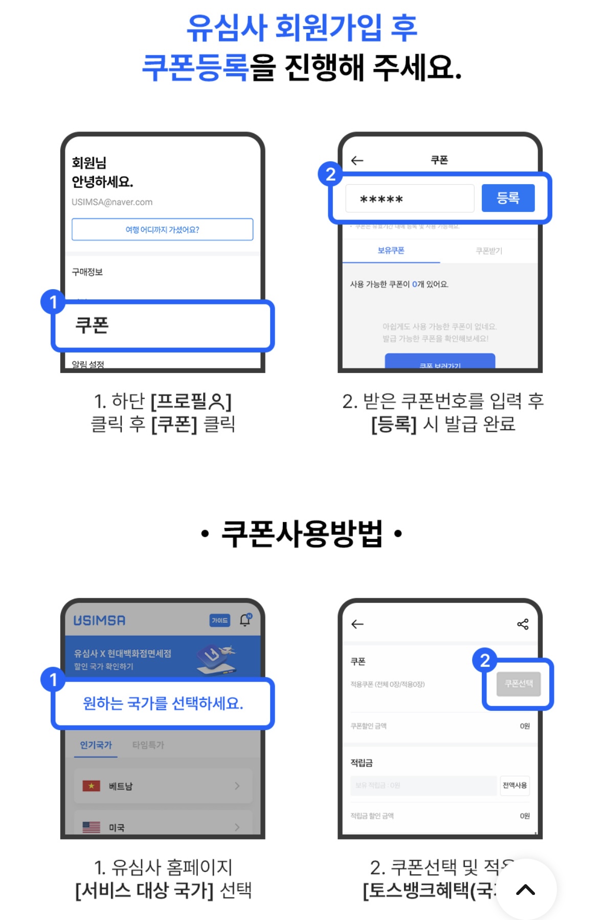 usimsa.com에 회원가입 후 프로필-쿠폰을 클릭해 쿠폰번호 등록 후 eSIM구입 시 사용하시면 됩니다.