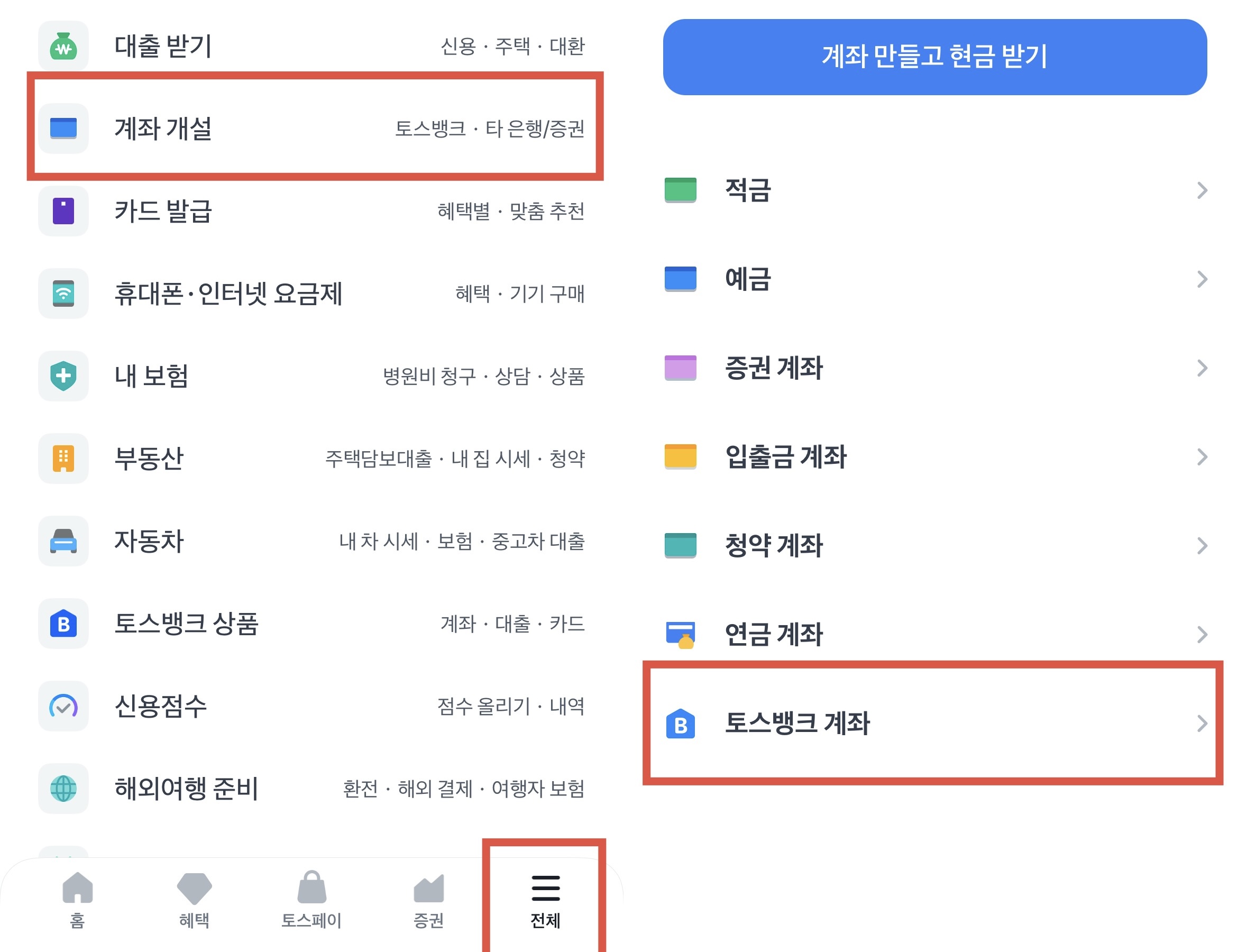 먼저 토스 뱅크 앱을 열어 오른쪽 하단의 전체-계좌개설-토스뱅크 계좌를 클릭합니다.