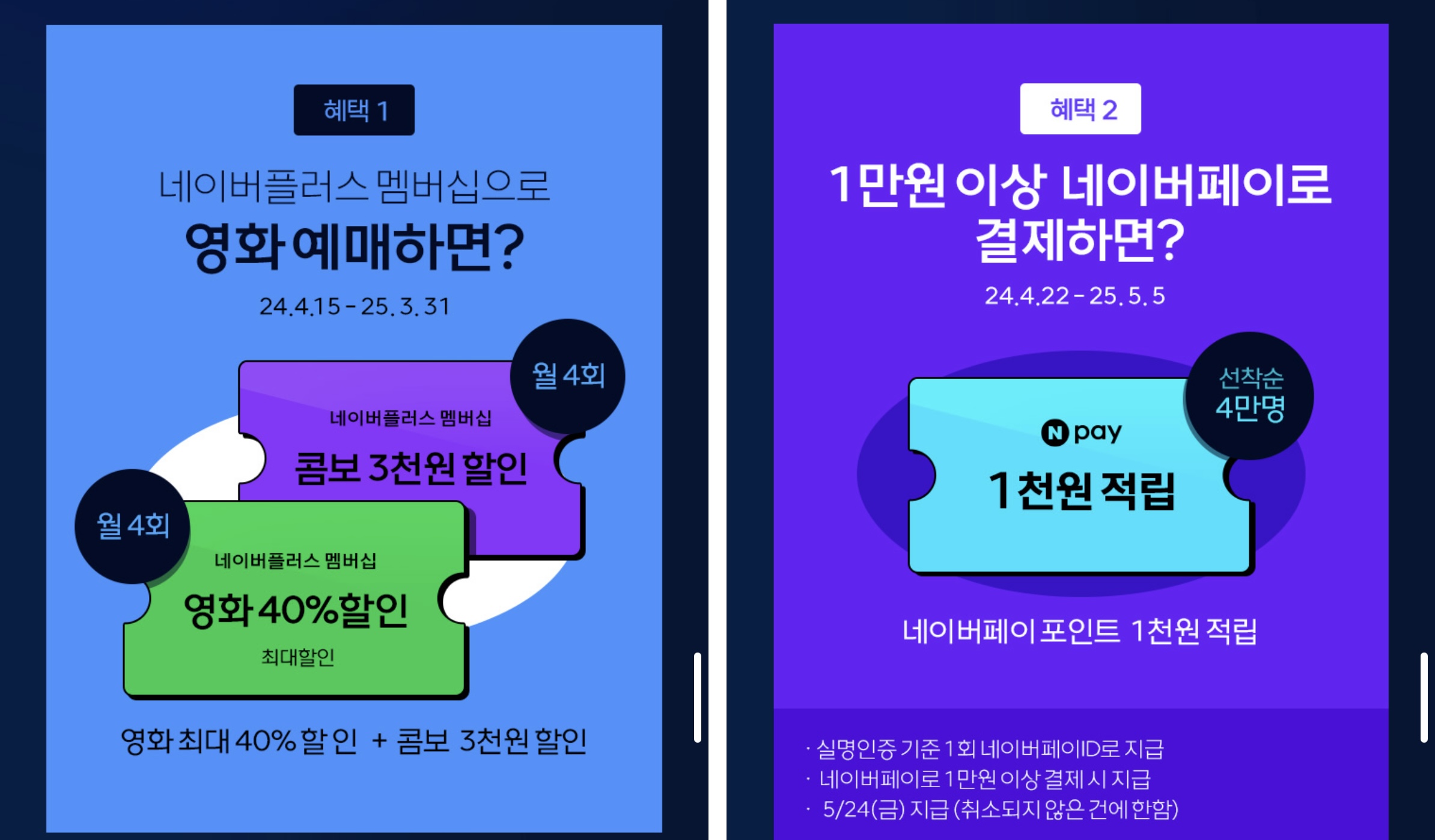 네이버 플러스 멤버쉽 회원이라면 네이버페이로 결제해 영화 40%할인과 콤보 3천원 할인권을 받을 수 있습니다.