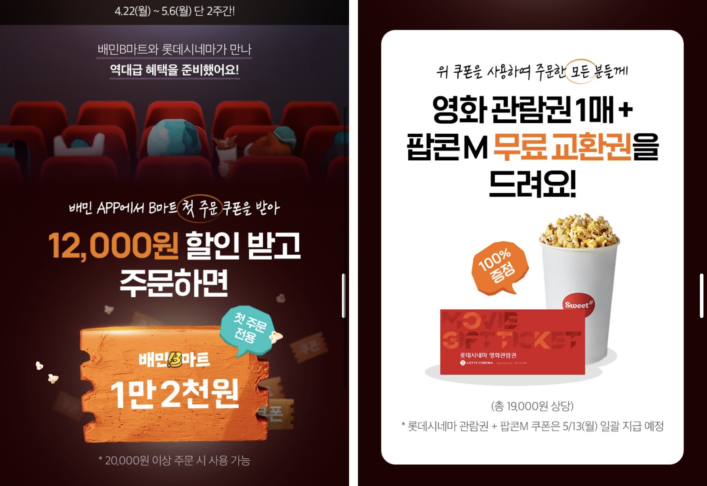 4월 22일부터 5월 6일까지 롯데시네마에서 제공하는 쿠폰으로 배민B마트를 주문하면 영화관람권과 팝콘을 받을 수 있습니다.