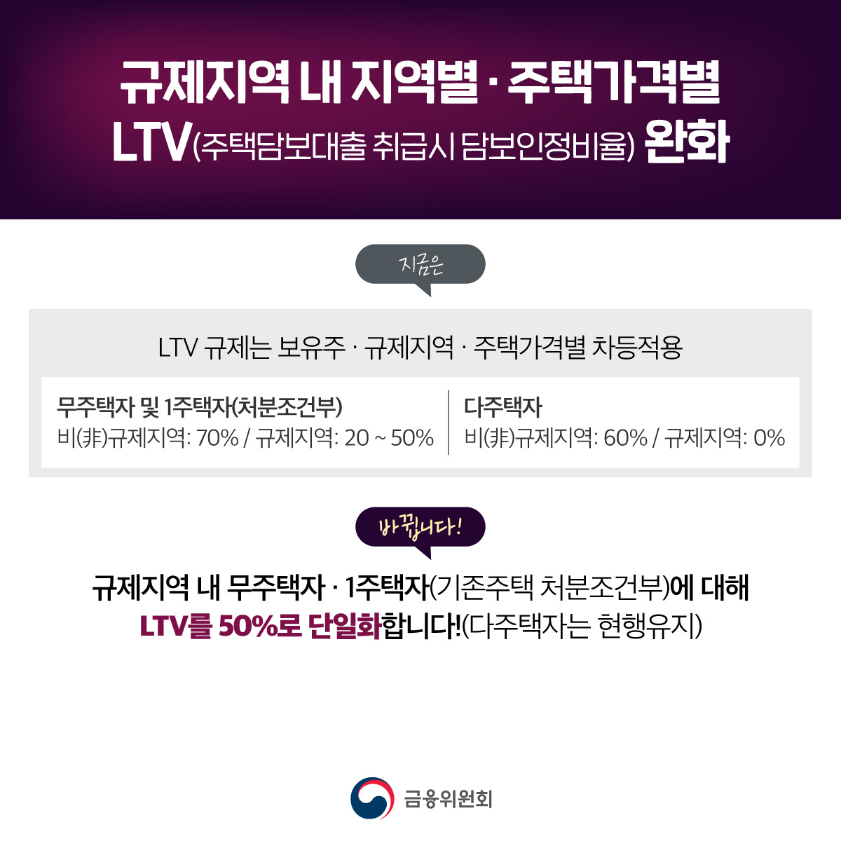 우선 규제지역 내의 무주택자,1주택자에 대해 LTV(Loan To Value ratio)를 50%로 단일화하였습니다. 이 정책은 내년부터 시행할 예정이었으나 시기를 한달 앞당긴 것입니다. 현행 LTV 규제는 보유주택, 규제지역, 주택가격별로 차등 적용되고 있었지만 앞으로는 다주택자를 제외하고 LTV를 주택가격과 무관하게 50%로 단일화 되었습니다. 서민, 실수요자들에겐 최대 6억원 한도 내에서 70%까지 LTV를 우대하기로 하였습니다.