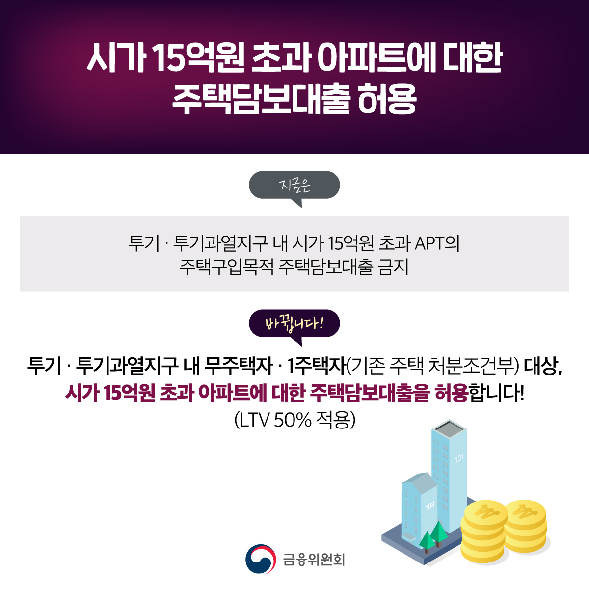 또한 현재는 금지되어 있던 투기과열지구 15억 초과 아파트애 대한 주택담보대출도 무주택자와 1주택자(기존 주택 처분저건부) 허용하기로 했습니다.