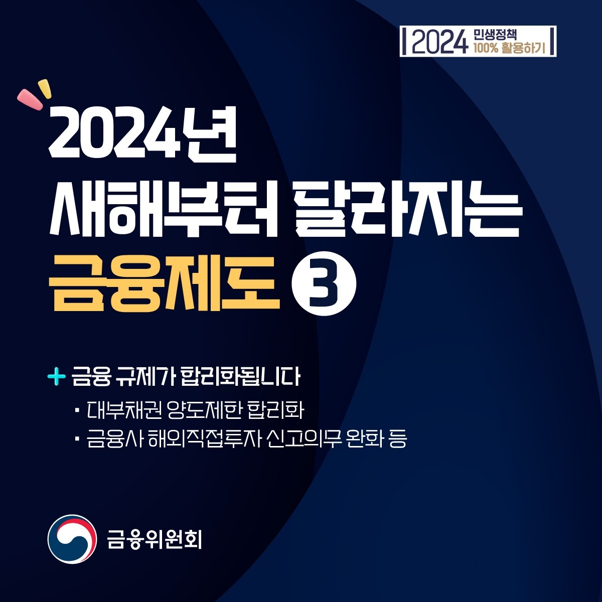 2024년 잘 보내고 계신가요?? 새해에 계획했던 일 잘 지켜지고 있는지 궁금합니다. 해가 바뀐 만큼 금융제도도 변화된 부분이 많았습니다. 금융위원회에서 제공하는 2024년 달라지는 금융제도에 대해 알아보겠습니다.