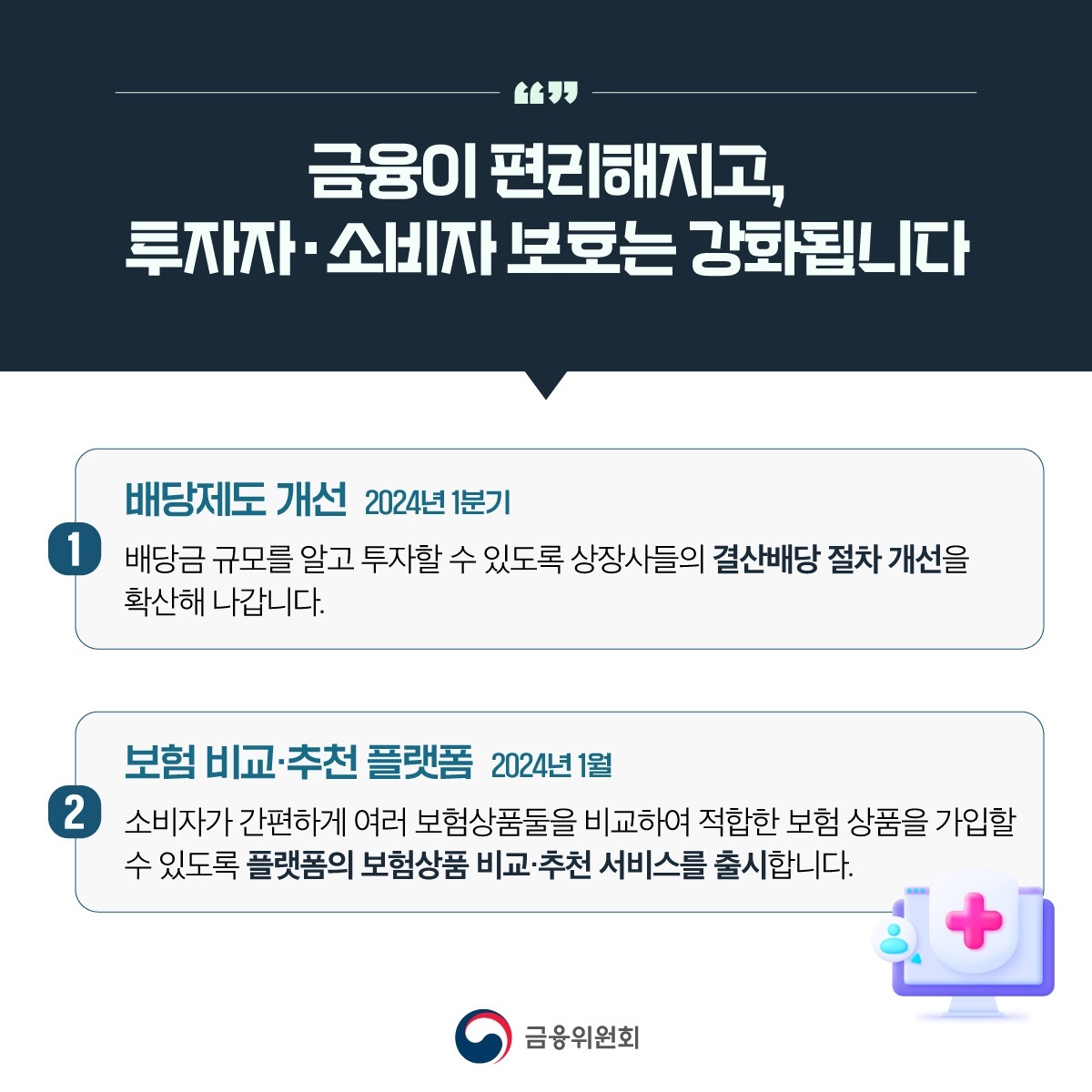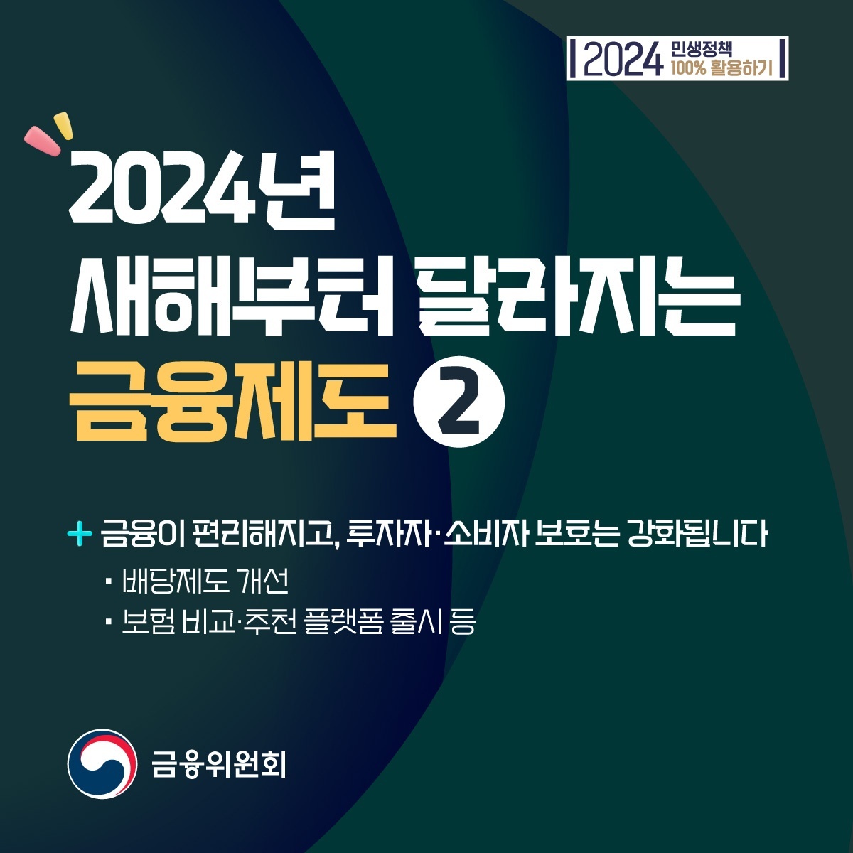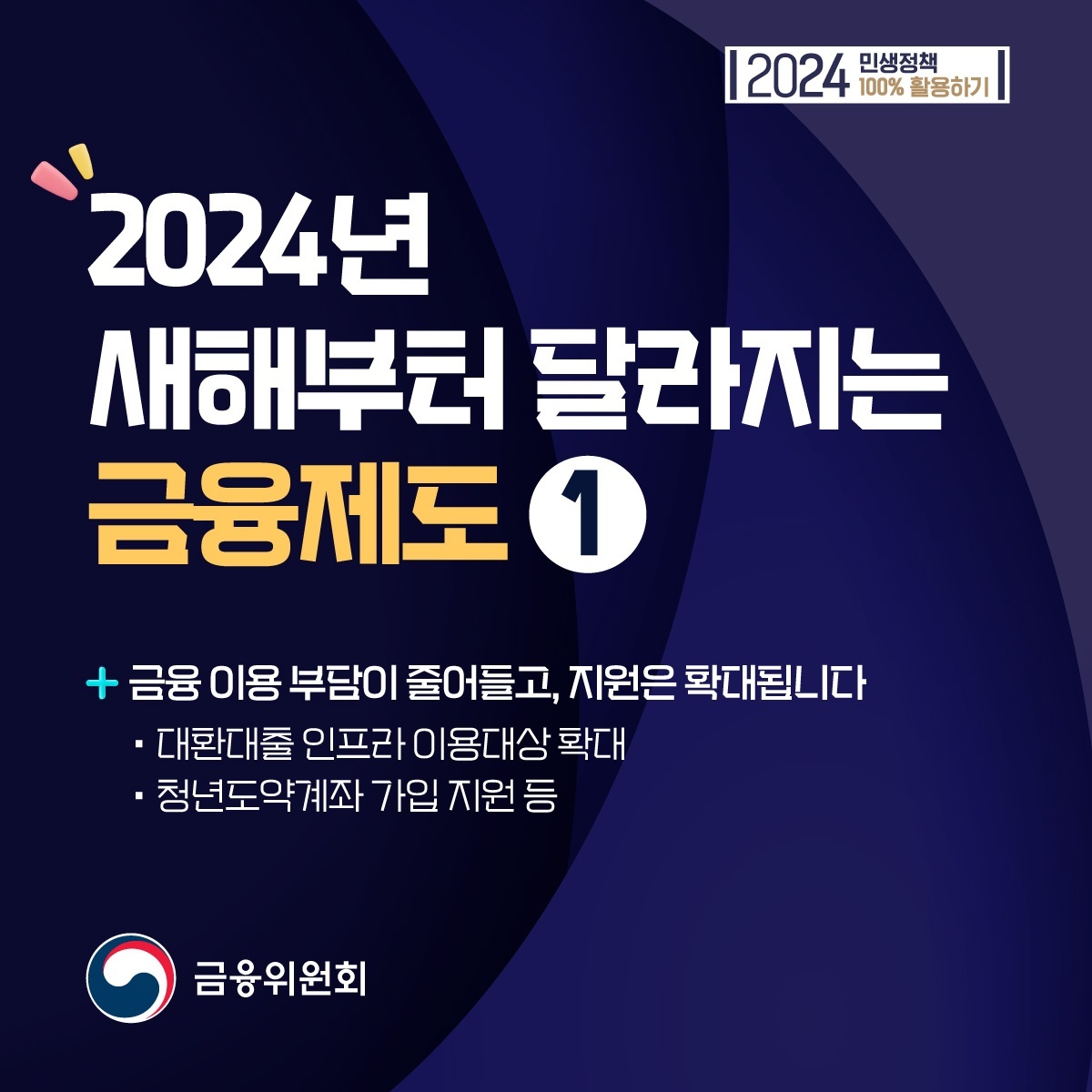2024년 잘 보내고 계신가요?? 새해에 계획했던 일 잘 지켜지고 있는지 궁금합니다. 해가 바뀐 만큼 금융제도도 변화된 부분이 많았습니다. 금융위원회에서 제공하는 2024년 달라지는 금융제도에 대해 알아보겠습니다.