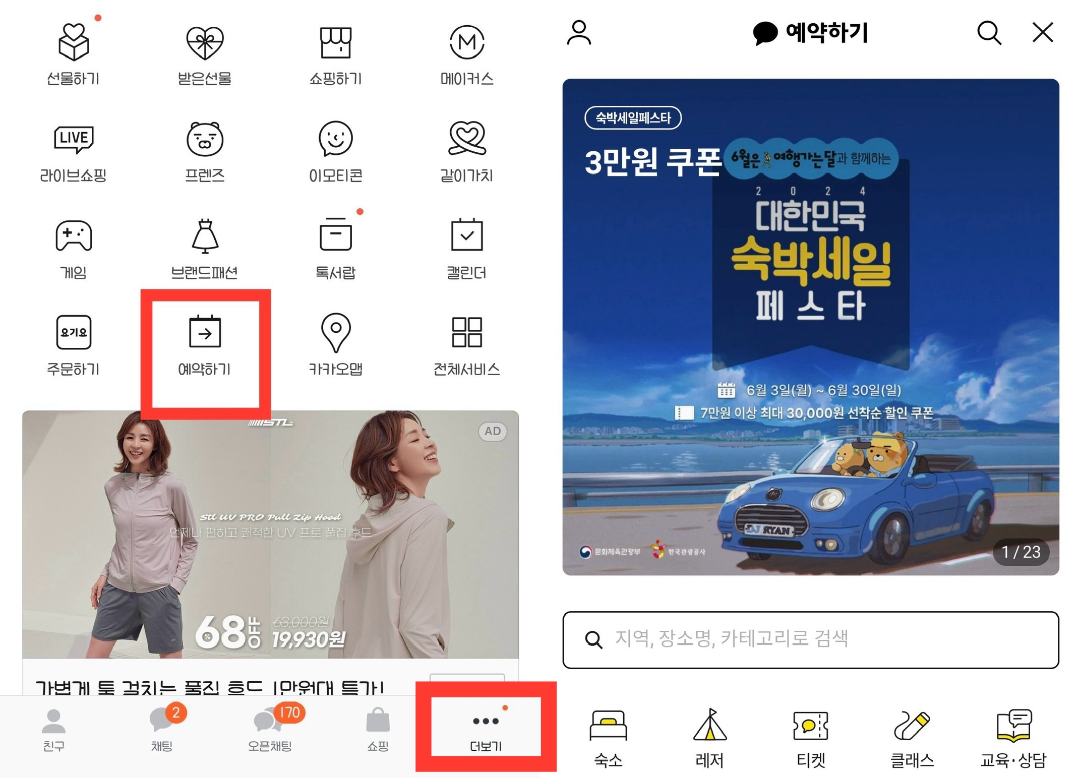 카카오톡의 더보기-예약하기-대한민국 숙박세일 페스타로 들어가 쿠폰을 다운로드할 수 있습니다.