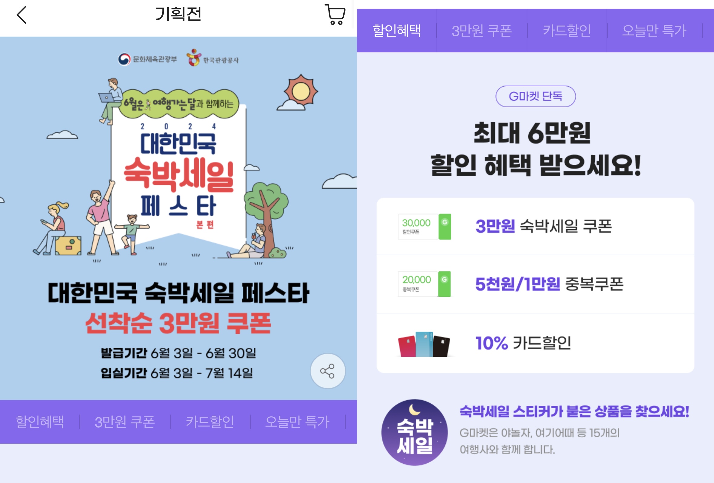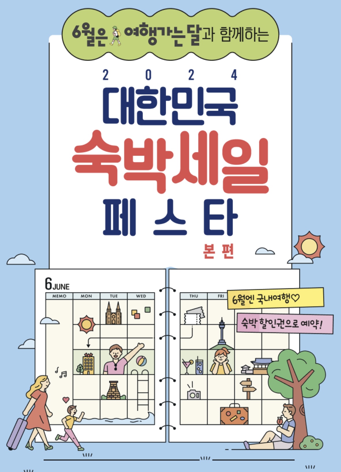 2024 대한민국 숙박세일 페스타는 문화체육관광부와 한국관광공사가 주최하는 숙박 할인 프로모션입니다. 이 행사는 국내 주요 지역의 숙박시설을 합리적인 가격으로 예약할 수 있는 기회를 제공하고 있으니 여름휴가를 앞두고 국내여행을 계획하시는 분은 할인 혜택을 활용하여 편안한 숙소를 예약해 보시기 바랍니다. 😋