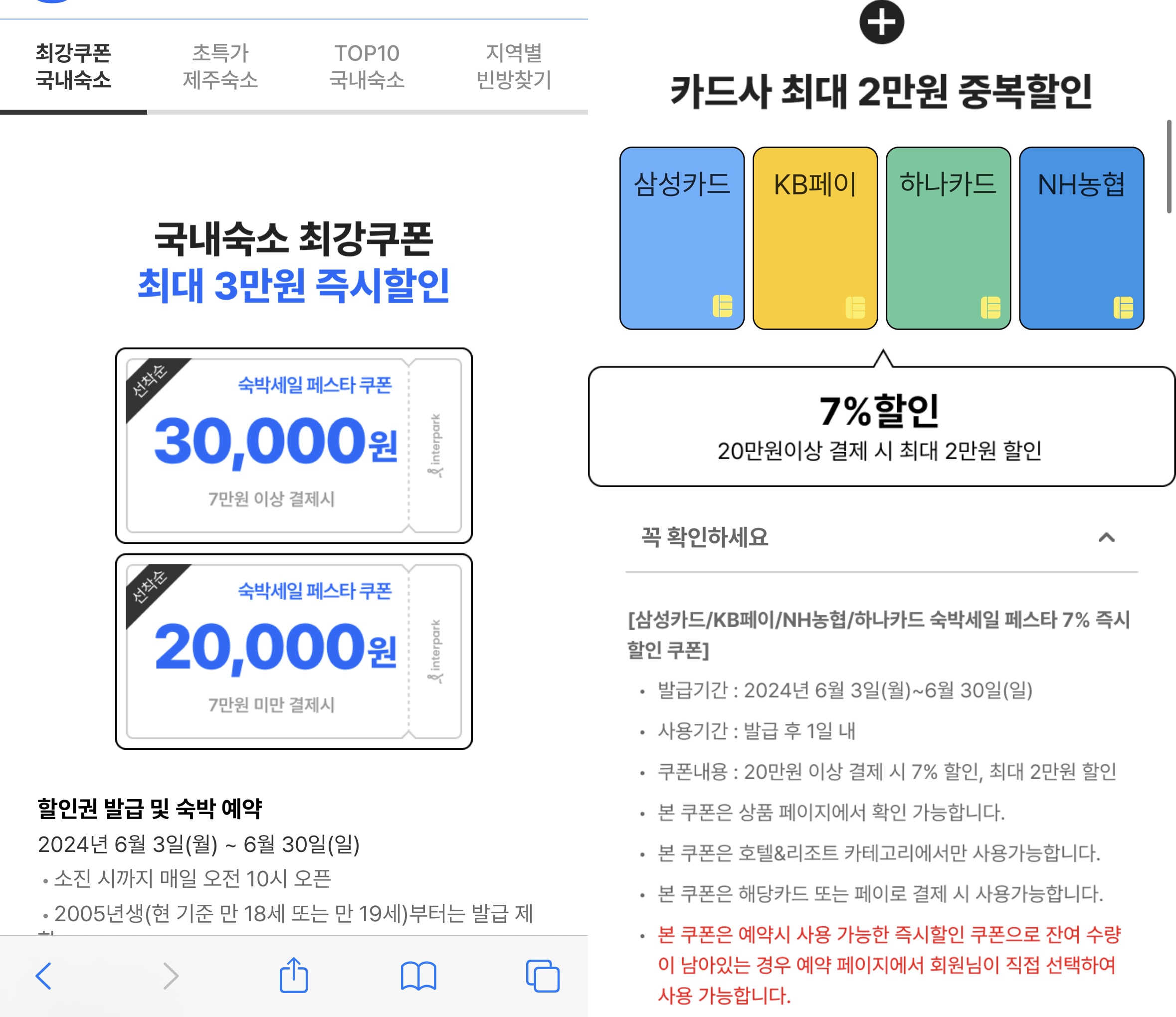 인터파크 투어에서는 기본 쿠폰 외에 삼성카드, KB페이, 하나카드, NH농협 카드를 이용할 경우 추가 7% 할인 행사를 진행하고 있습니다.