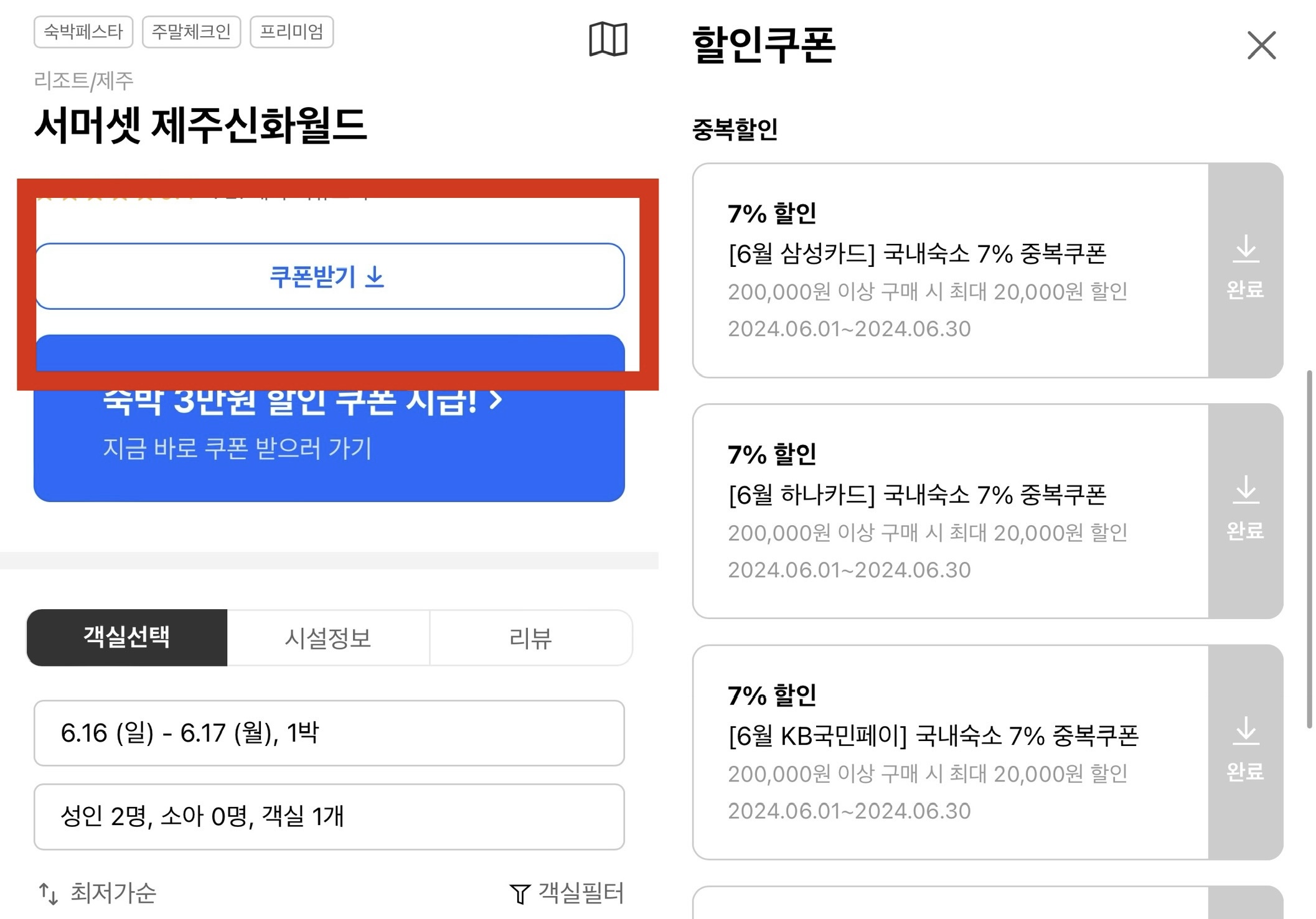 숙박할 숙소를 선택한 후에 쿠폰 받기 버튼을 클릭하여 추가 카드할인 쿠폰을 다운로드할 수 있습니다.