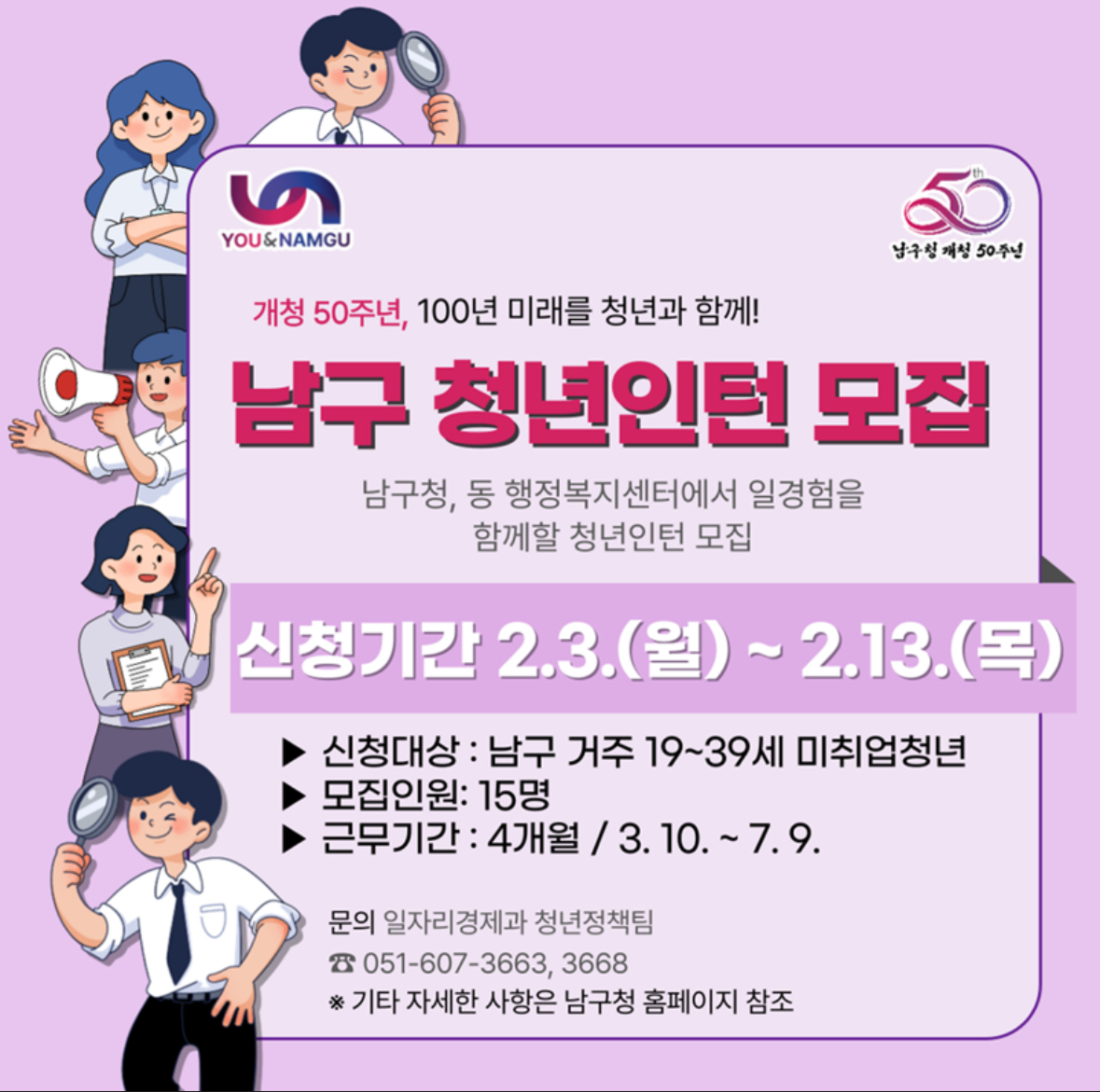 다가오는 2025년 2월 3일부터 부산 남구에서는 '2025년 상반기 남구 청년인턴 일경험사업'이 시작됩니다. 남구청은 개청 50주년을 기념하며 이 사업을 마련하였고, 지역 청년들이 직무 경험을 쌓고 취업 경쟁력을 강화할 수 있는 기회를 마련하게 되었습니다. 특히, 현재 취업난으로 고군분투하는 청년들에게는 더없이 소중한 기회가 될 것입니다. 본 글에서는 남구 청년인턴 일경험사업의 대상과 업무내용, 급여 등 자세한 내용 안내해 보겠습니다.