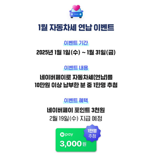 - 자동차세 연납: 2025년 1월 1일부터 31일까지 네이버페이로 자동차세 연납 10만 원 이상 납부한 분 중 추첨을 통해 3천 원 포인트 지급.