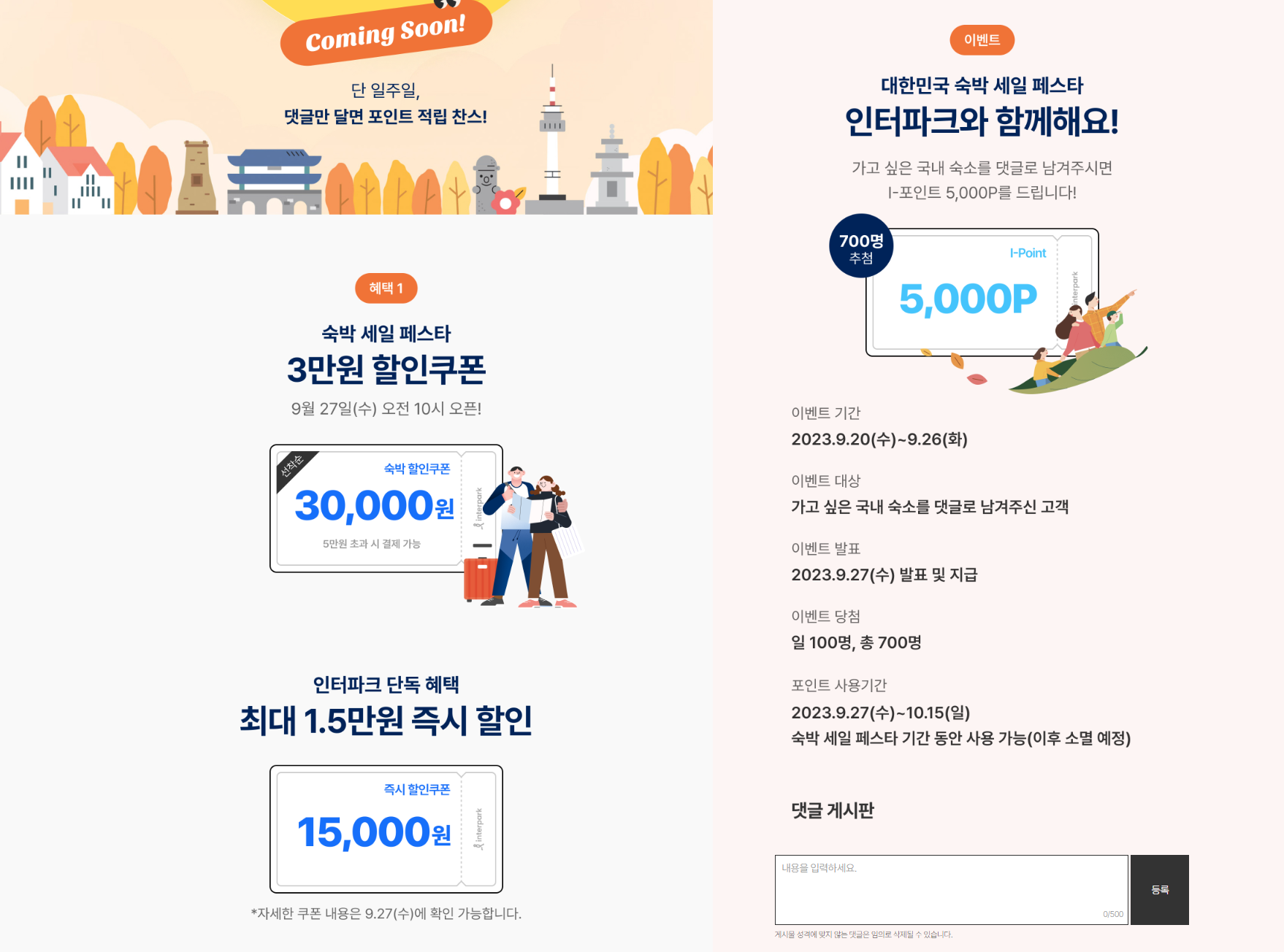 제가 여행시 자주 이용하는 인터파크에서 숙박할인권 관련 내용을 찾아보았습니다. 3만 원 할인 쿠폰과 함께 인터파크 단독 혜택으로 15,000원 즉시 할인 쿠폰도 함께 증정한다는 내용과 가고 싶은 숙소를 댓글로 남기면 I-포인트 5,000P를 받을 수 있는 이벤트를 진행하고 있으니 참여하셔서 추가 혜택도 받으시면 좋을 것 같습니다. 댓글 이벤트는 9월 26일까지 진행하고 있습니다.