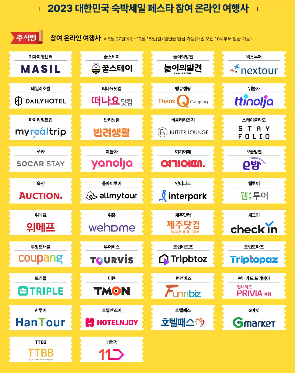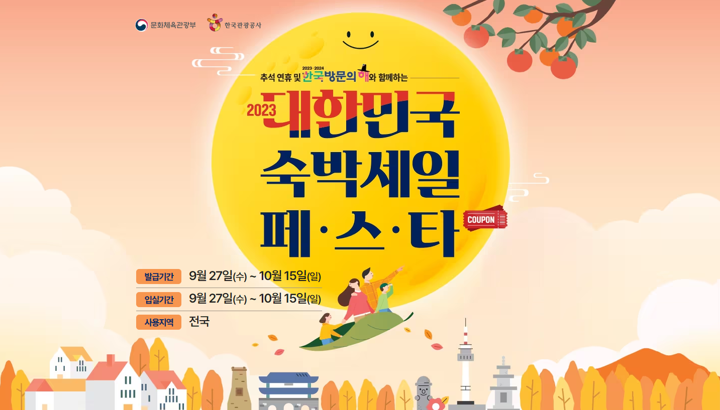 추석 연휴가 끝나고 나면 10월 27일부터 연이어 '대한민국 숙박세일 페스타 전국편'도 진행된다고 하니 자세한 내용을 원하시는 분들은 한국관광공사 '대한민국 구석구석 누리집' 내 '2023 대한민국 숙박 세일 페스타(https://ktostay.visitkorea.or.kr/)' 안내 페이지를 확인해 보시면 좋겠습니다.