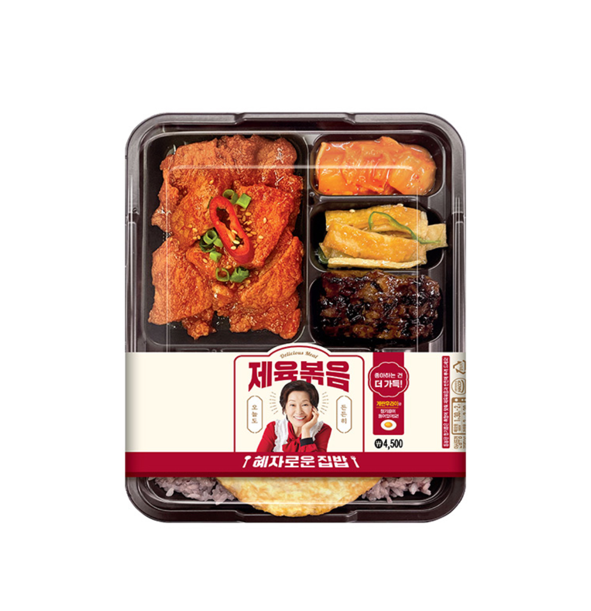 - 혜자로운 집밥 제육볶음: 흑미밥, 제육볶음, 떡갈비, 어묵볶음, 볶음김치, 반숙계란후라이로 구성된 도시락입니다. 제육볶음은 살짝 매콤하고 부드럽고, 떡갈비와 어묵볶음은 달달하고 쫄깃합니다. 볶음김치는 신선하고 고소하고, 반숙계란후라이는 촉촉하고 부드럽습니다. 참기름을 제육볶음에 뿌려서 더 맛있게 먹을 수 있습니다. 칼로리는 726kcal입니다.
