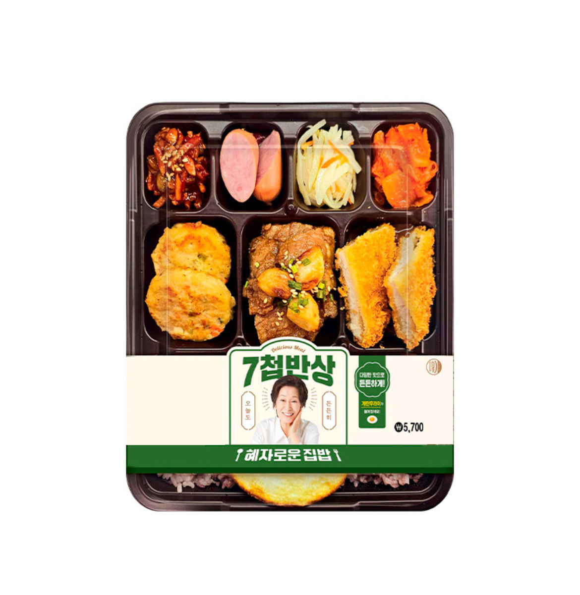 - 혜자로운 집밥 7첩반상: 진미채, 비엔나 소세지, 감자볶음, 볶음김치, 동그랑땡, 간장불고기, 돈가스, 흑미밥, 반숙계란후라이로 구성되어 있습니다. 칼로리는 1,014kcal 입니다.