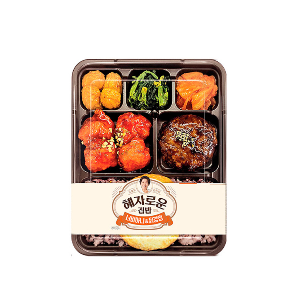 - 혜자로운 집밥 너비아니 닭강정: 흑미밥, 계란, 닭강정, 너비아니 어묵조림, 참나물, 볶음김치, 도시락 김으로 구성되어 있습니다. 칼로리는 692kcal입니다.