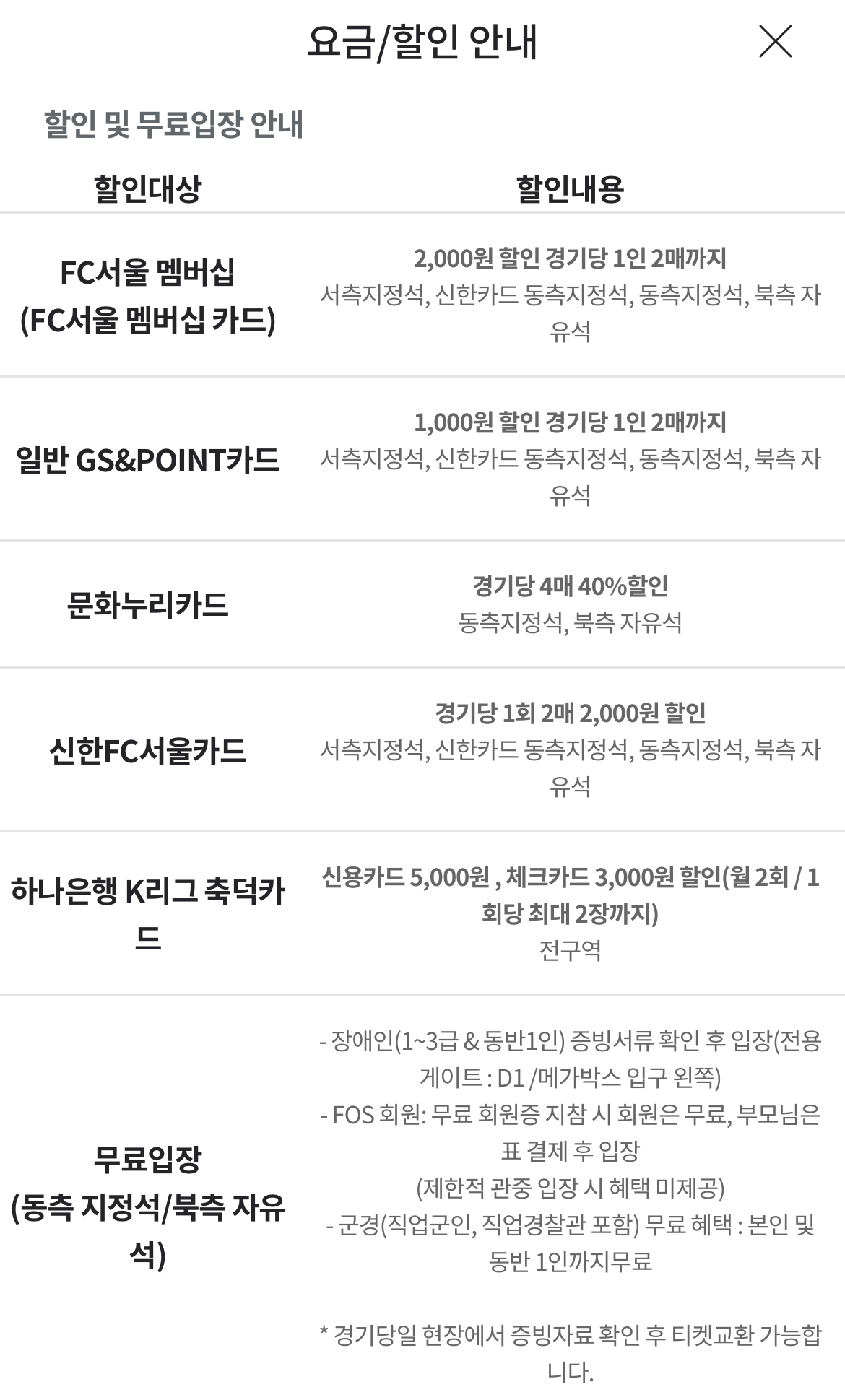 공식 FC 서울 웹사이트 또는 티켓링크를 방문합니다. 원하는 좌석을 선택하고 예매를 완료하면 됩니다. 티켓을 할인받는 방법은 아래의 표를 확인해주시면 됩니다.