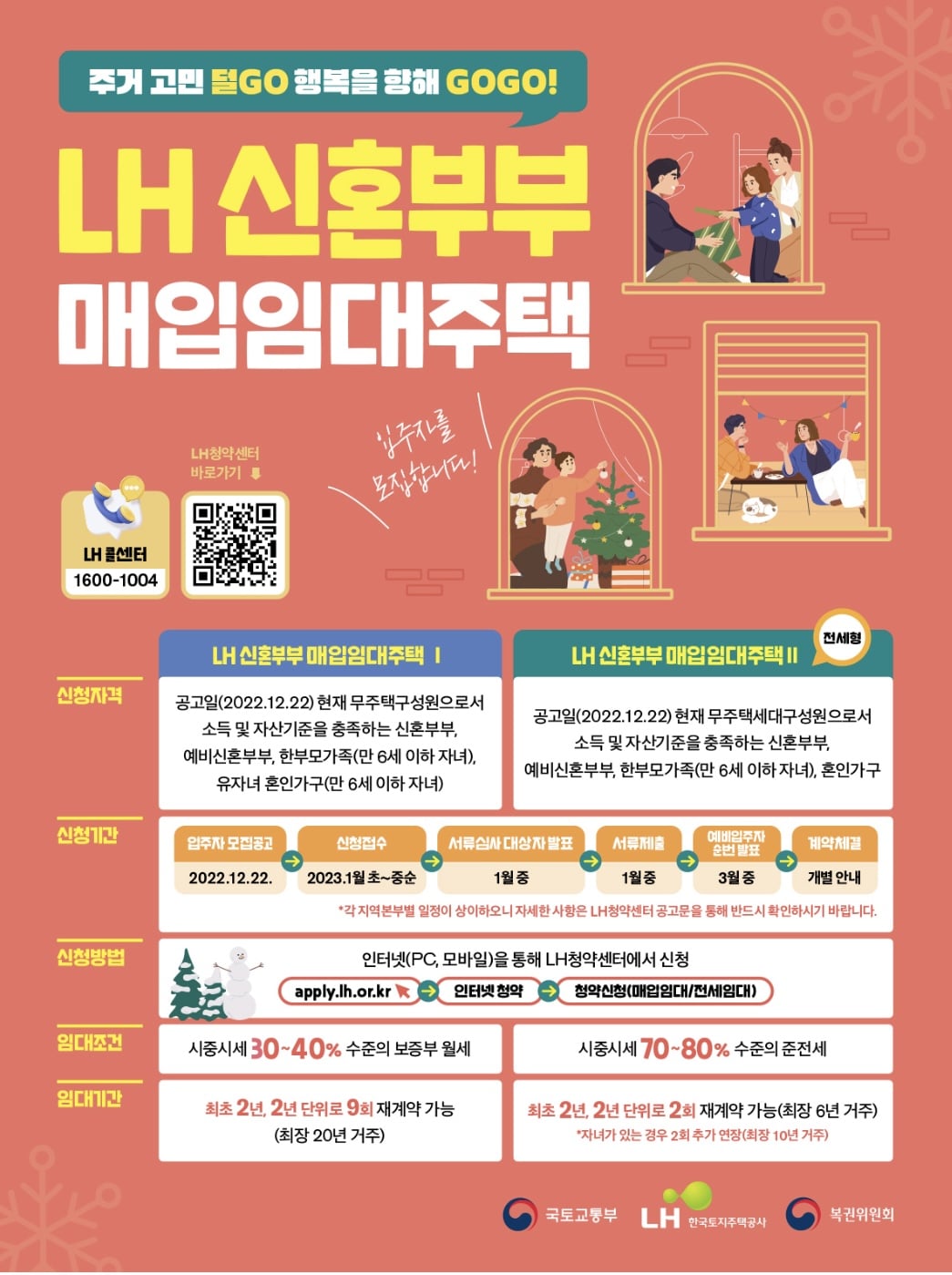 LH에서 청년과 신혼부부를 대상으로 임대 주택을 분양하는 사업을 2023년 1월부터 신청받습니다. 당첨이 될 경우 4월에 바로 입주가 가능하기 때문에 상반기 이사를 준비하는 분들에게는 좋은 소식이 될 거라 생각됩니다. 지금부터 자세한 내용 알아보겠습니다